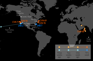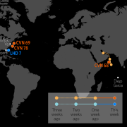 This map shows the approximate locations of U.S. Carrier Strike Groups and Amphibious Ready Groups.